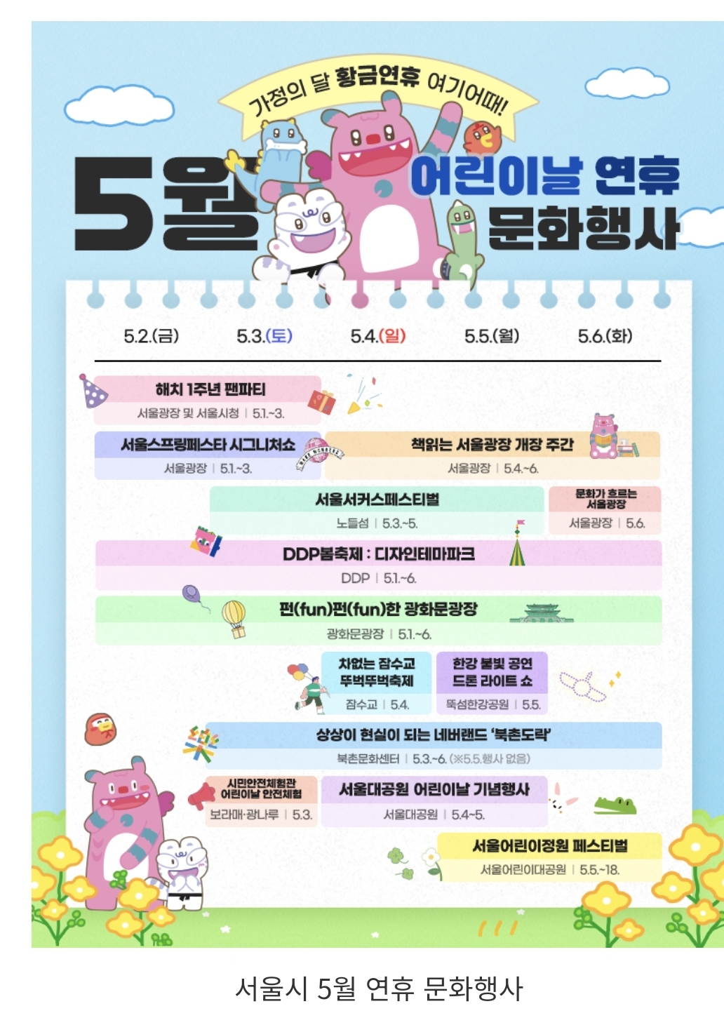 Home 카테고리 없음 가정의 달 5월 황금연휴 서울시 문화행사 총정리 가정의 달 5월 황금연휴 서울시 문화행사 총정리 한사랑1004 2025. 5. 2. 5월 어린이날 문화행사안내 공유하기 게시글 관리 남매맘과 함께하는 정보통 댓글