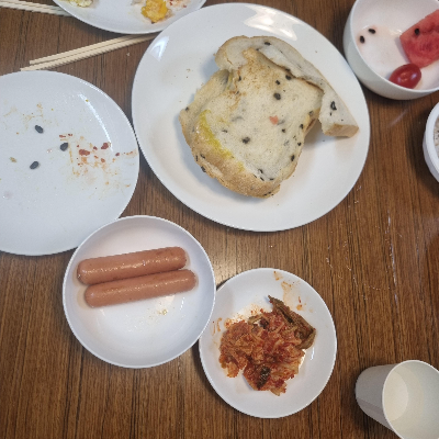 빵토스트, 계란후라이, 햄구이, 김치, 사발면, 우유