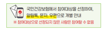 국민건강보험에서 참여 대상을 선정하여, 알림톡, 문자, 우편으로 개별안내를 하게 됩니다.