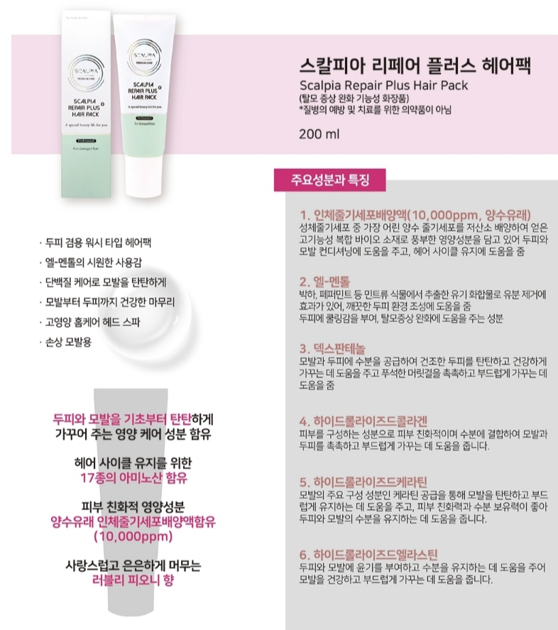 셀비아 스칼피아 리페어 플러스 헤어팩은 두피와 모발을 동시에 케어할 수 있는 제품으로, 다음과 같은 효과가 있습니다: