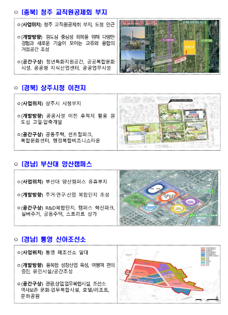 (충북) 청주 교직원공제회 부지, (경북) 상주시청 이전지, (경남) 부산대 양산캠퍼스, (경남) 부산대 양산캠퍼스,