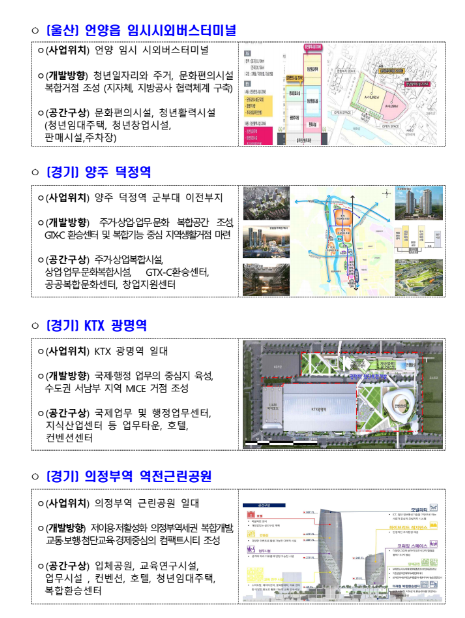 -국토교통부는 지자체의 공간재구조화계획, 사업시행자와의 공공기여 협상 등 구역 지정을 위한 후속 절차가 원할하게 진행될수 있도록 사전 컨설팅, 공공기여 가이드라인 마련 등을 지원할 방침이라고 합니다.