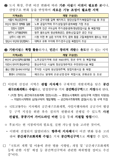 -후보지는 현 시점에서 필요성, 실현 가능성을 고려한 것이며, 이번에 선정되지 않았더라도 향후에 지자체에서 여건 변화등을 고려하여 공간재구화계획 수립을 거쳐서 공간혁신구역으로 지정할 수 있다고 합니다.