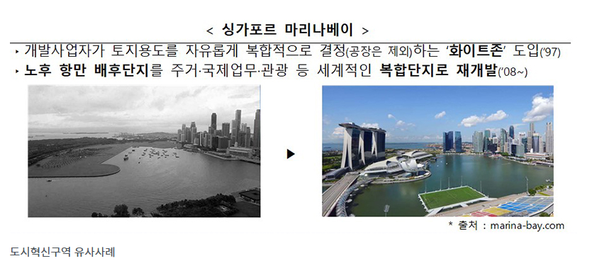 외국에서 공간혁신구역으로 진행된 곳은 참고로 싱가포르 마리나베이가 화이트존 도입으로 세계적인 복합단지로 재개발 대표적인 곳입니다.