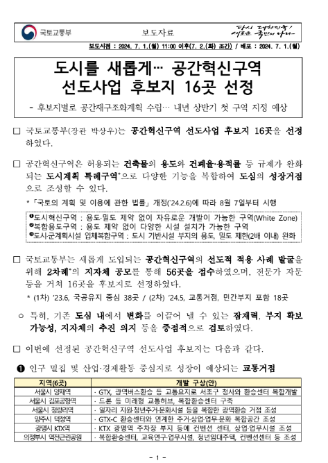 국토부 공간혁신구역 선도사업 후보지 16곳 선정(보도자료 원문)