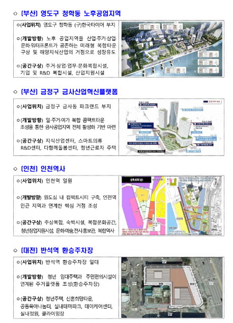 (부산) 영도구 청학동 노후공업지역, (부산) 금정구 금사산업혁신플랫폼, ( 인천)인천역사, (대전) 반석역 환승주차장