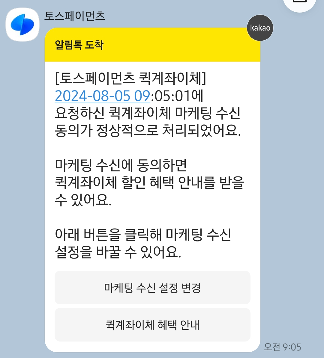 토스페이머트 퀴계좌이체 등록, 마케팅 수신, 퀵계좌이체완료되었다는 문자가 와요.