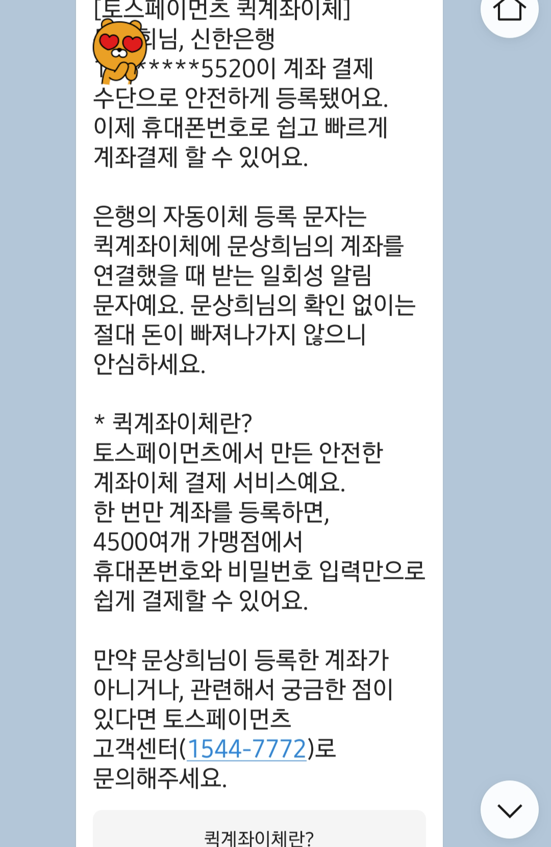 토스페이머트 퀴계좌이체 등록, 마케팅 수신, 퀵계좌이체완료되었다는 문자가 와요.