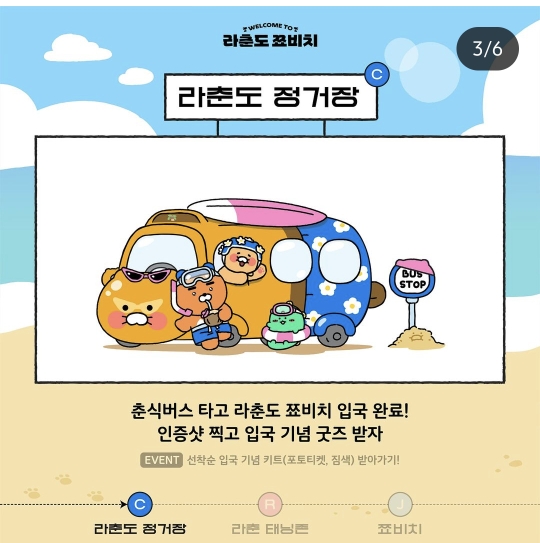 춘식버스 타고 라춘도 쬬비치 입국 후 기념 굿즈 받기
