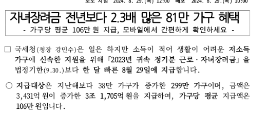 올해는국세청에서 소득이 적어서 생활이 어려운 저소득가구 지원을 위해서 <2023년 귀속 정기분 근로자녀장려금>을 법정기한 9월 30일보다 한달빠른 8월 29일에 지급한다는 좋은 소식이 전해졌습니다.