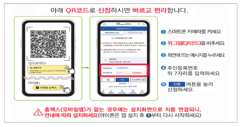 큐알(qr)코드를 스마트폰 카메라로 비출때 생성되는 메시지를 누르고 신청화면에서 주민등록번호 뒤 7자리를 입력하여 신청합니다.