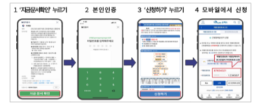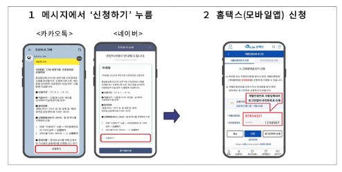 메시지의 '신청하기;를누르고 신청화면에서 ;주민등록번 뒤 7쟈리를 입력하여 신청합니다.
