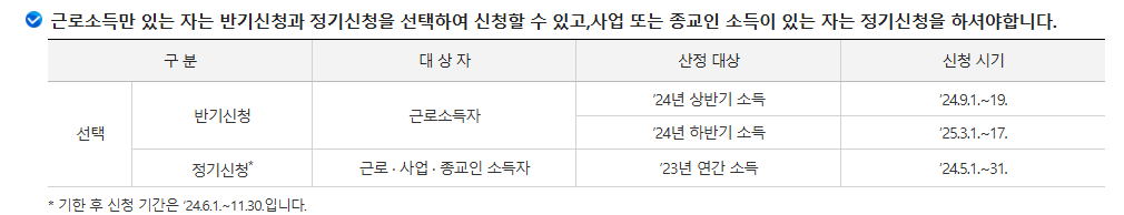 1) 근로소득자에 한해서 반기신청과 정기신청 선택 가능합니다.
