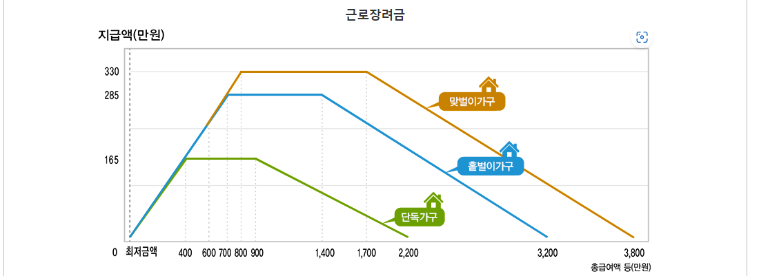 일은 하지만 소득이 적어서 생활이 어려운 근로자, 사업자(전문직 제외)가구에 대하여 가구원 구성과 근로소득, 사업소득 또는 종교인소득에 따라 산정한 근로장려금을 지급하게 됩니다.