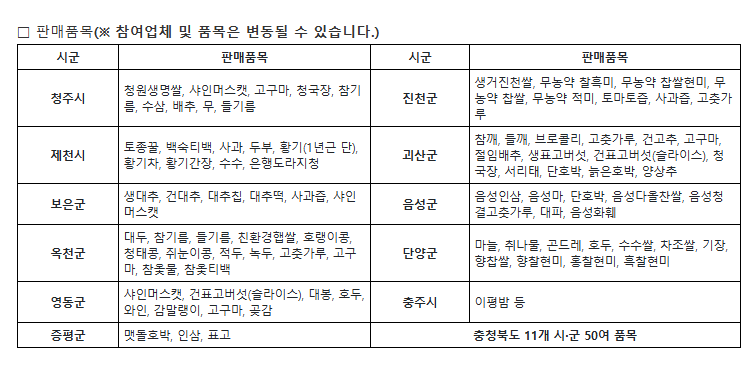 충청북도 11개 시군의 대표 농특산물 50여 품목을 홍보 및 판매할 예정입니다.