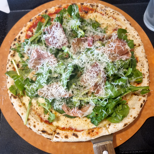 토마토 소스와 루꼴라, 프로슈토 햄을 올려 만든 정통 나폴리 피자인데요.