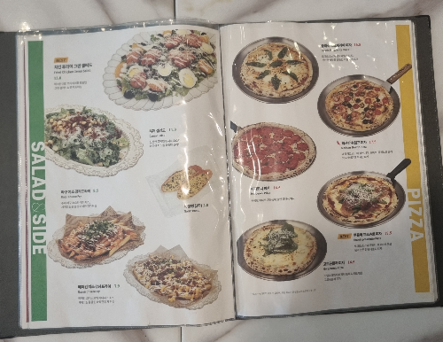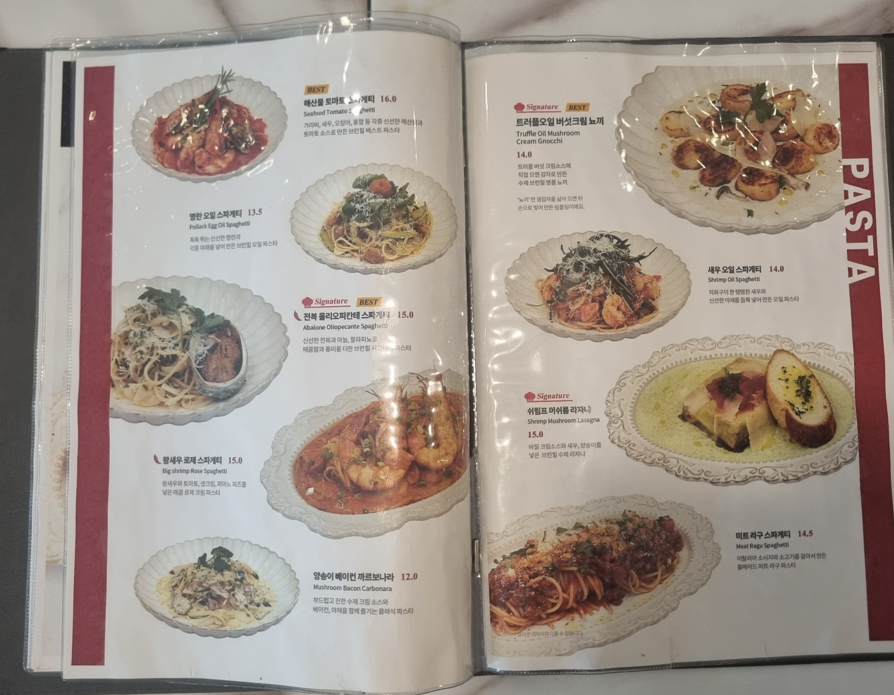 스테이크, 파스타, 브런치 샐러드 사이드, 음료, 와인, 케잌류가 다양한 메뉴가 있었어요.