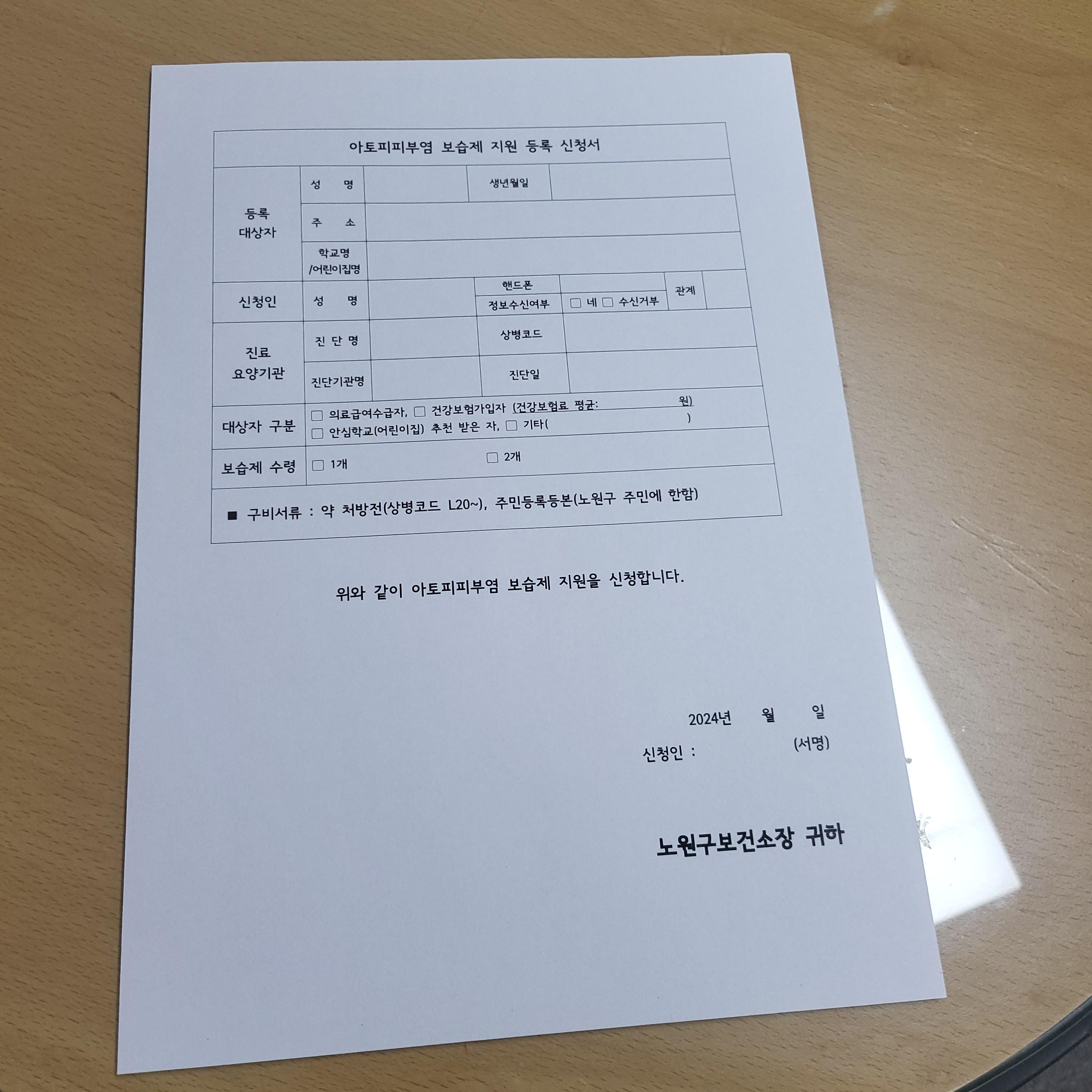 직원분이 아토피피부염 보습제 지원 등록 신청서를 주시는데요.