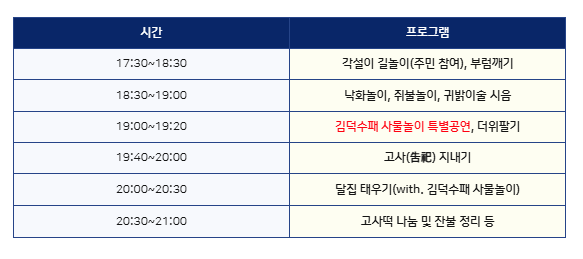 체험프로그램, 각설이 길놀이, 부럼깨기, 귀밝이술 마시기, 낙화놀이, 불깡통 돌리기, 더위팔이, 고사 지내기, 달집 태우기, 고사떡 나눠먹기가 시간별로 진행됩니다.