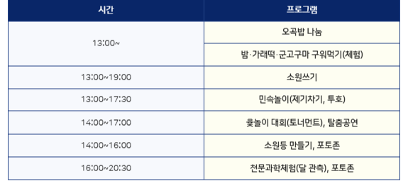 올해도 어김없이 다섯가지 곡물로 지어진 오곡밥을 함께 나눠먹고, 밤과 가래떡, 고구마를 먹을 수 있고 소원을 적어 달집태우기, 제기차기 투호등을 현장에서 즐길수 있는 체험들이 많이 기다리고 있네요.