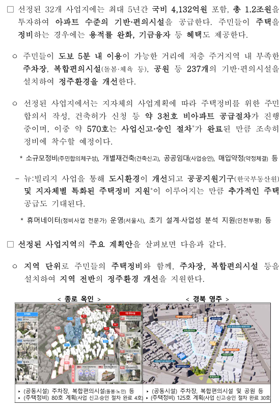 선정된 32개 사업지에는 최대 5년간 국비 4,132억원 포함해서 총 1.2조원을 투자해 아파트 수준의 기반편의설을 공급하게 되는데요~