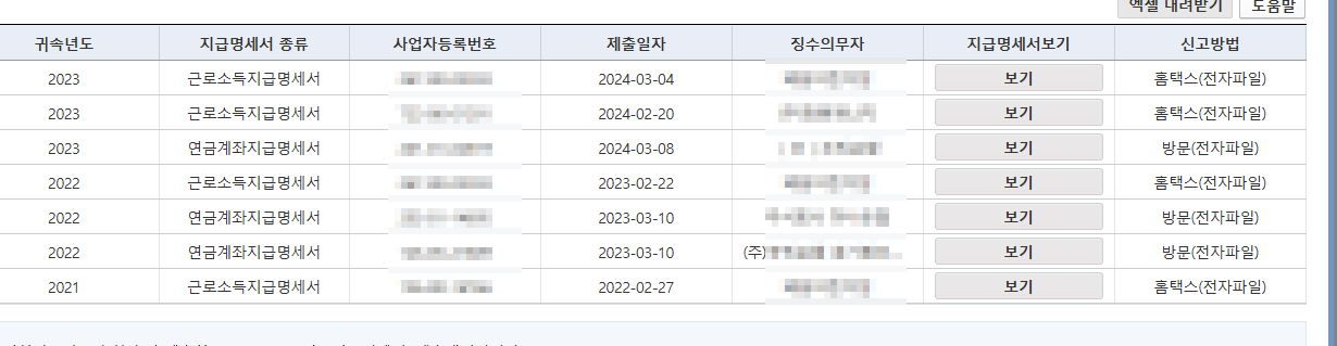 귀속년도을 확인하시고 지급명세서 보기를 클릭하시면 출력 가능합니다.