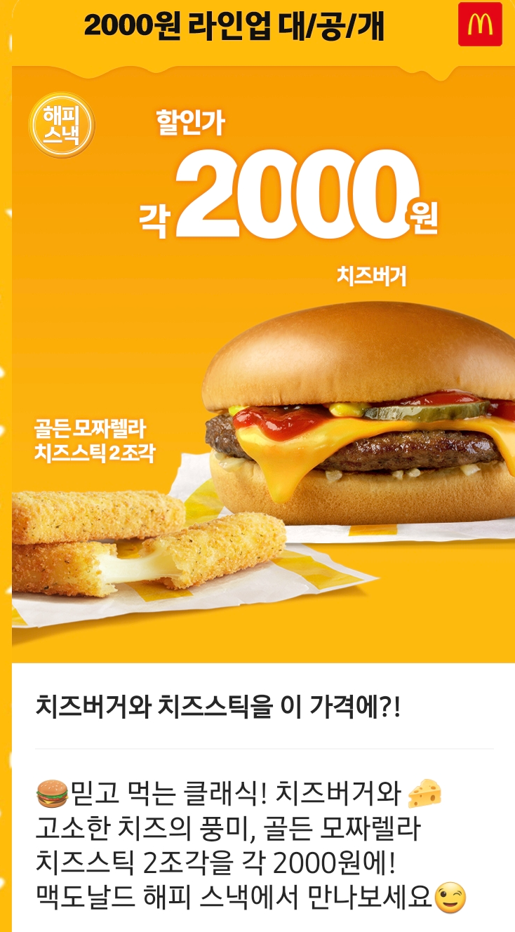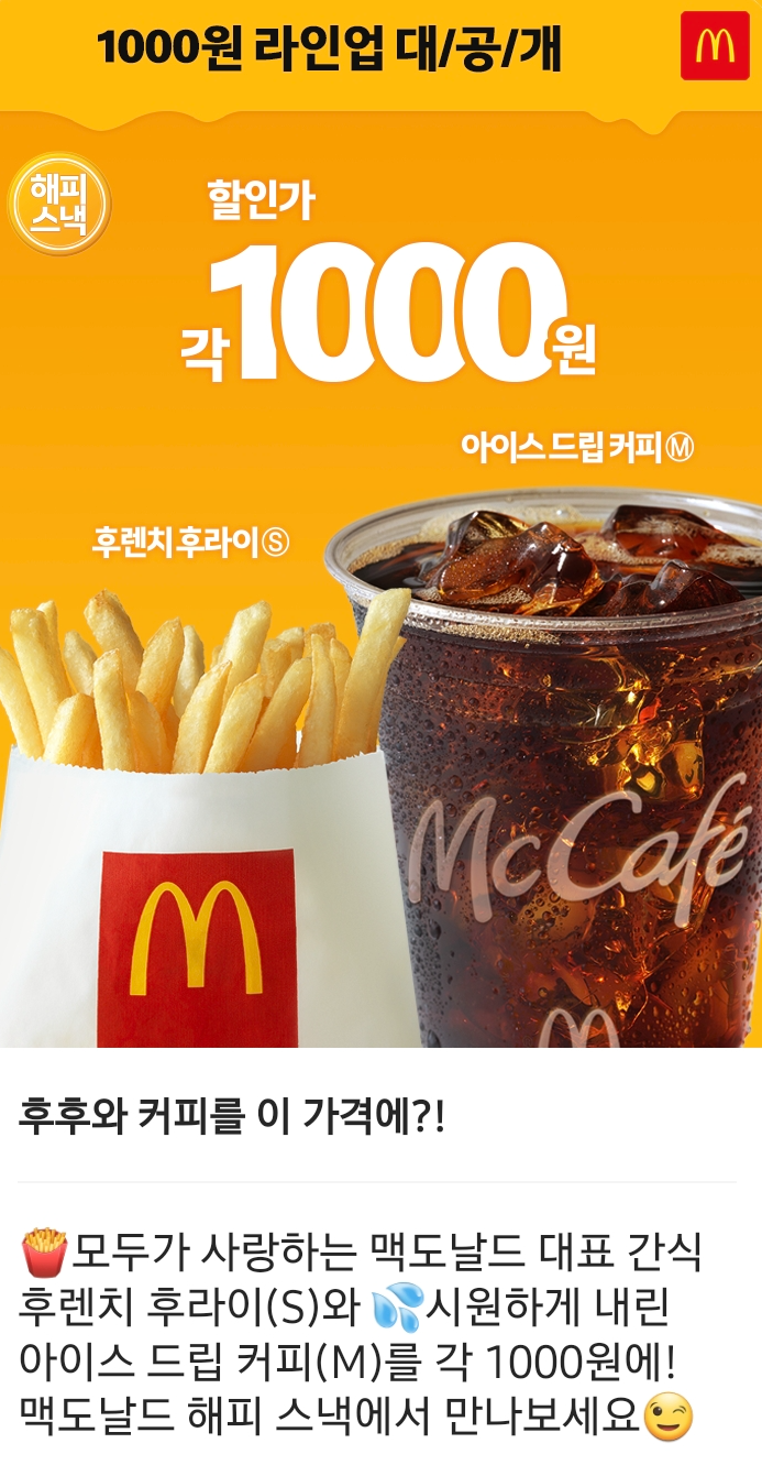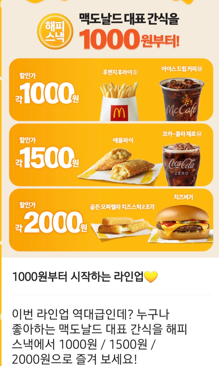 이번 해피 스낵 라인업은 메뉴에 따라 1000원, 1500원, 2000원으로 맥도날드 대표 간식을 즐길수 있어서 소개시켜 드립니다.