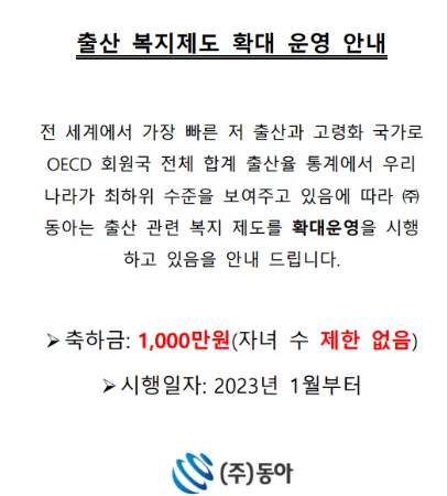 직원 자녀 출산시 첫째 300만원, 둘째 400만원, 셋째 이상 500만원 지급됩니다.