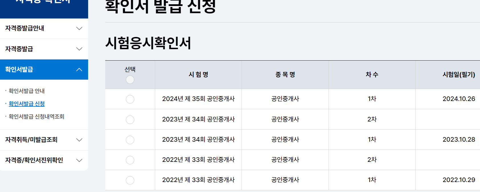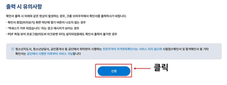 2단계- 확인서 발급 신청 페이지에서 [시험응시확인서] 선택 후 신청 버튼 클릭!