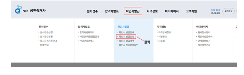 상단메뉴 중 [확인서발급] 클릭 -왼쪽 메뉴 중 [확인서 발급신청]을 클릭하고 응시확인서 이미지를 등록합니다.