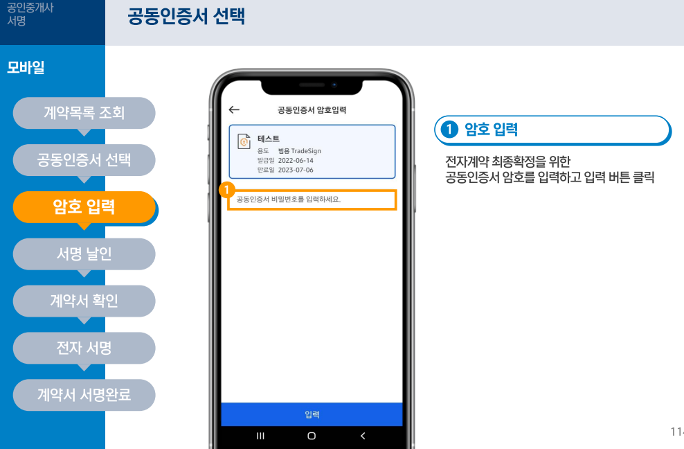 전자계약 최종확정을 위한 공동인증서 암호를 입력하고 입력 버튼을 클릭합니다.
