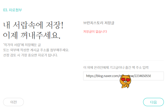 '작가의 서랍'에 저장해 둔 글 또는 외부에 작성한 게시글 주소를 첨부해 주세요.