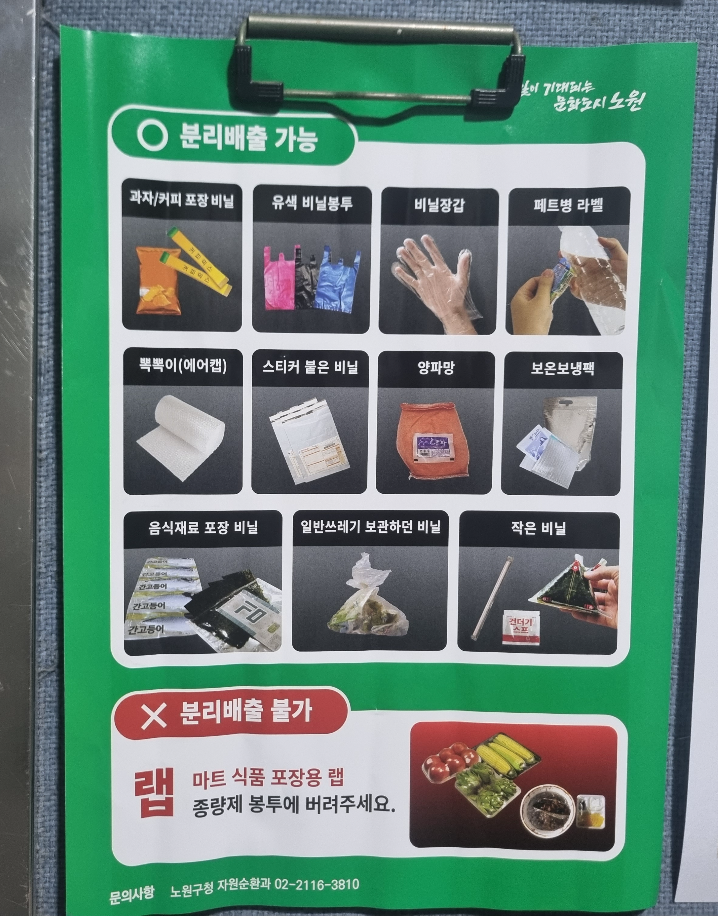 제가 살고 있는 노원구에서 각 단지마다 안내물로 폐비닐 배출에 대한 안내를 하면서 적극적으로 분리배출을 잘 할수 있도록 안내를 하고 있는데요.