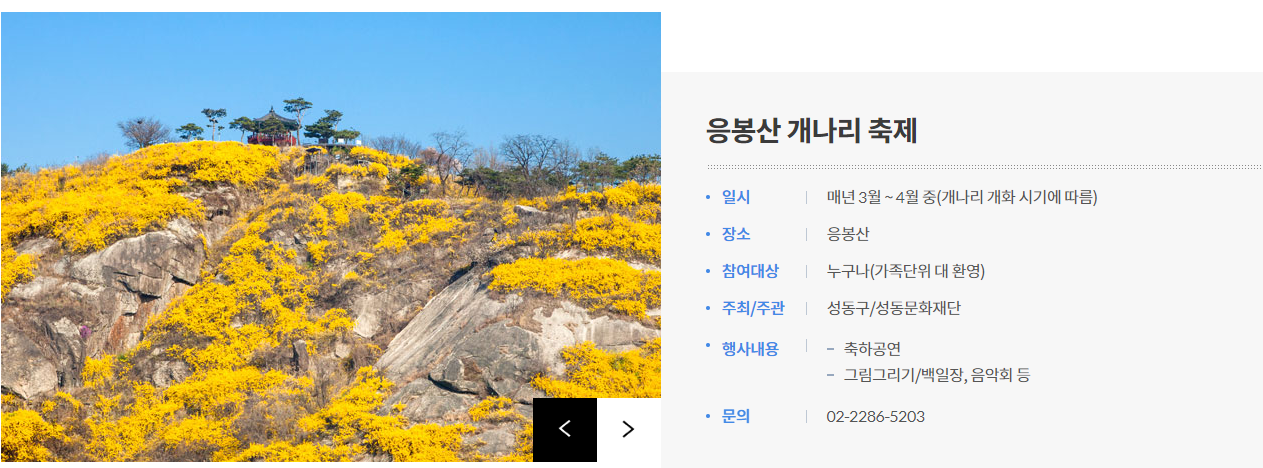 응봉산의 개나리는 보통 응봉공원 부근에서 볼 수 있으며, 개나리 축제도 매년 열리며 많은 이벤트와 함께 방문객들에게 즐거운 시간을 제공합니다.