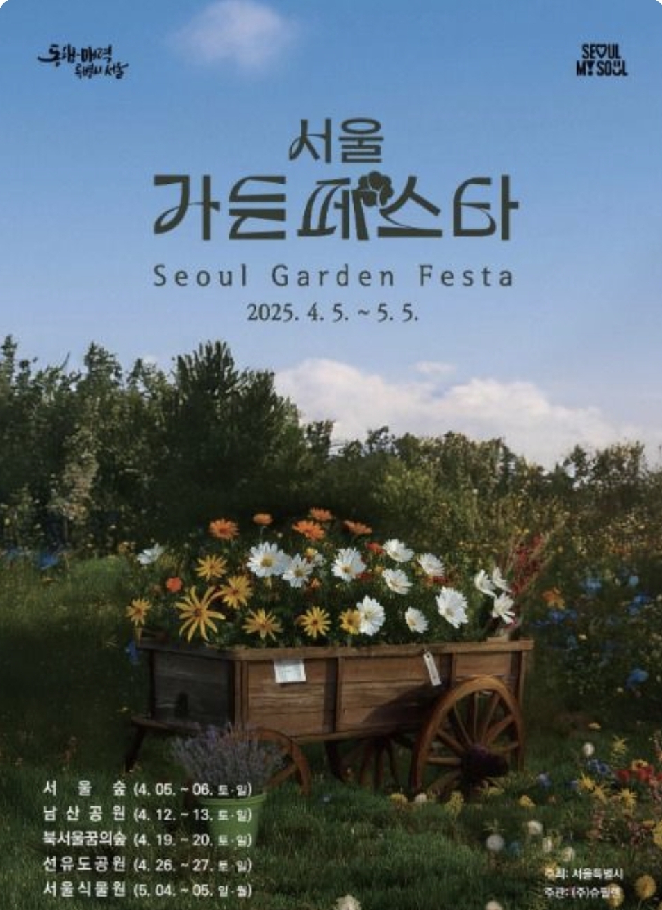 4월 한달내내 진행되는 <서울가든페스타> 는 벚꽃, 튤립, 수선화 등 봄꽃으로 가득한 공원에서 재미있는 콘텐츠와 함께 봄을 만끽 할수 있도록 운영됩니다.