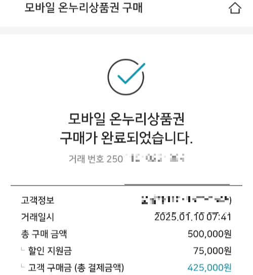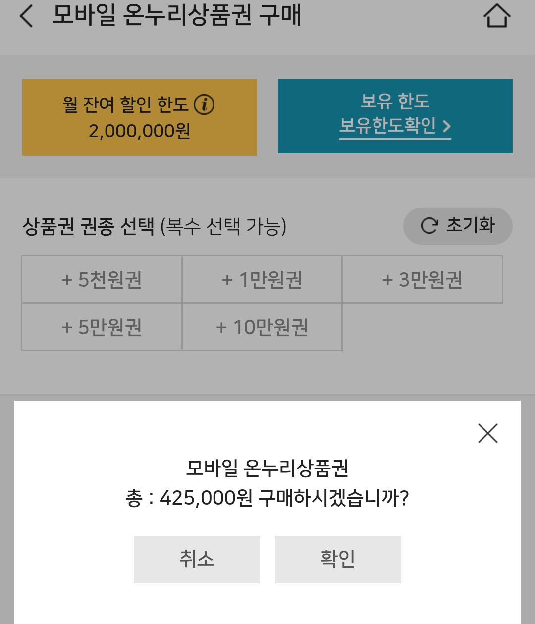 모바일 온누리상품권 총: 425000원 구매하시겠습니까?