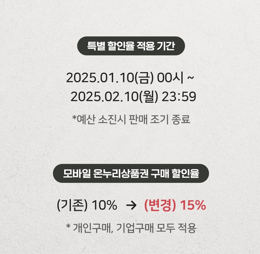모바일 온누리상품권 할인율을 15% 일시적 상향하여 판매합니다.