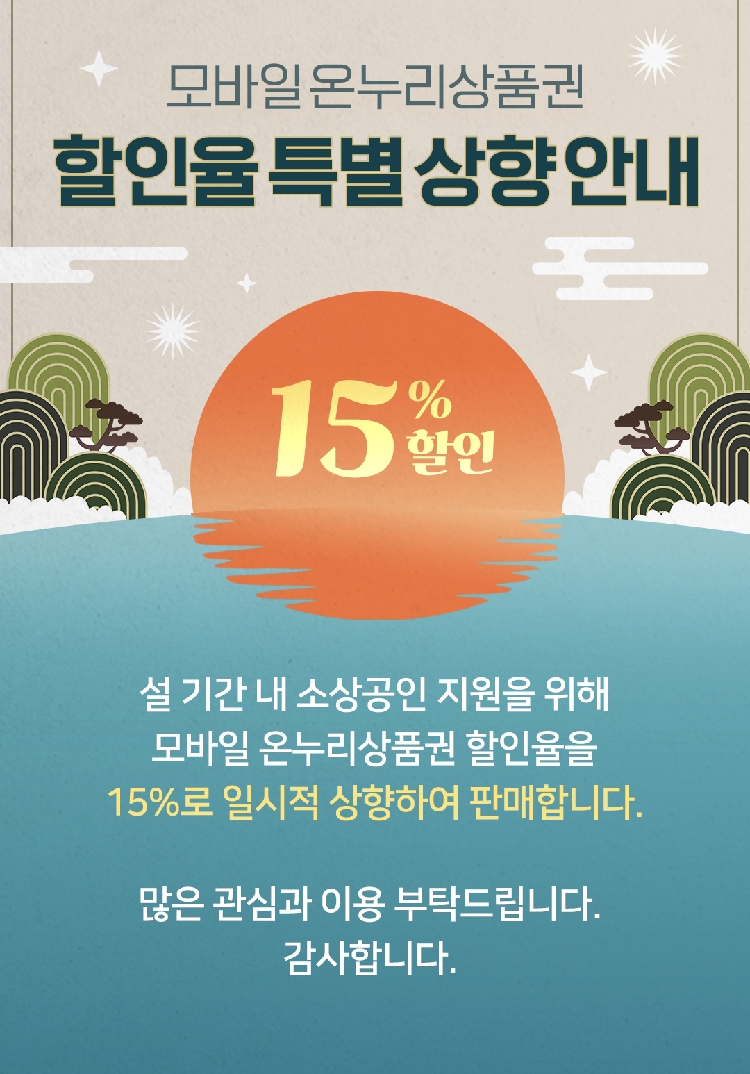 설날을 맞이해 모바일온누리상품권 할인율이 15% 특별 상향되었습니다.