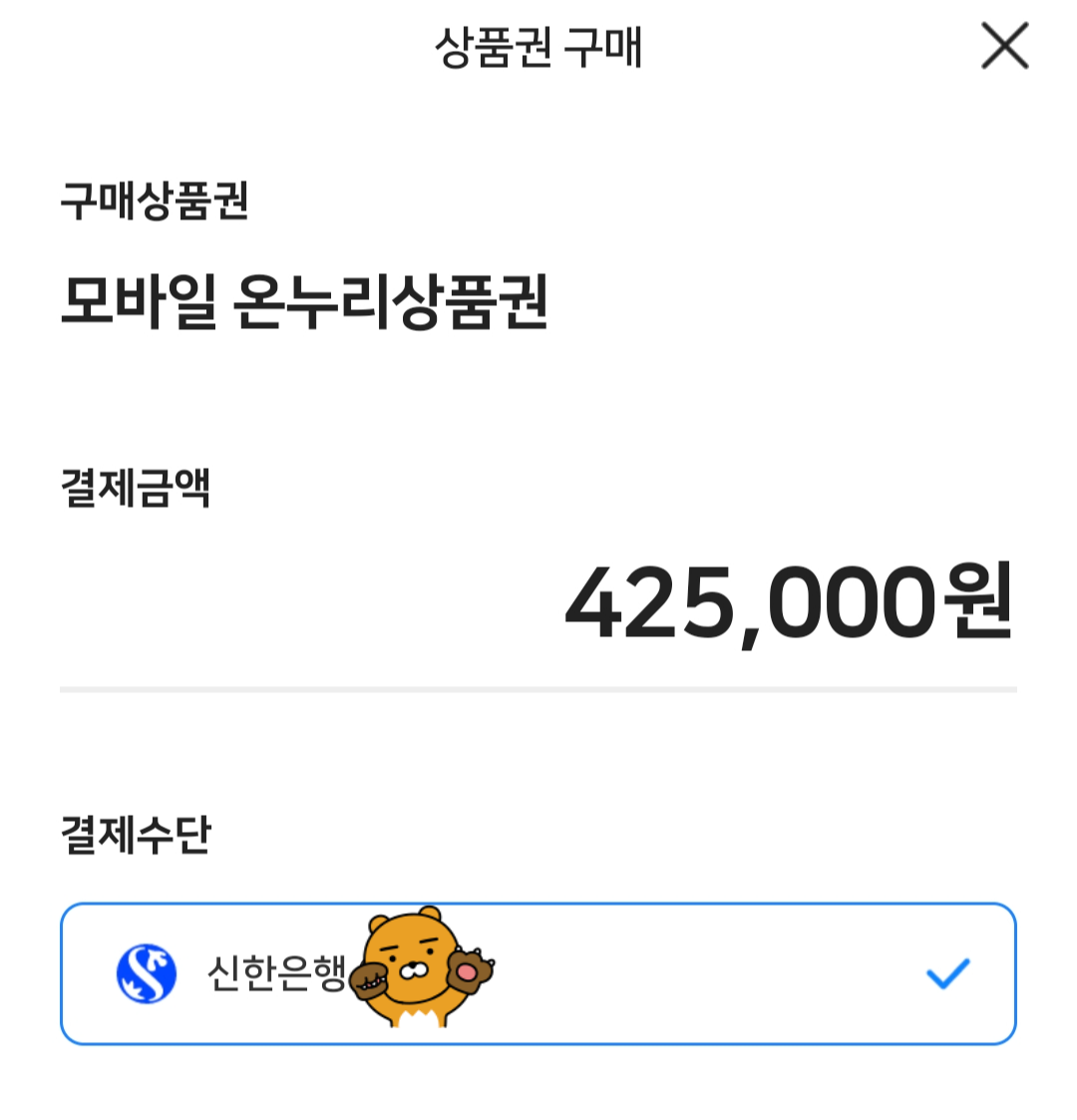 모바일 온누리상품권 총: 425000원 구매하시겠습니까?