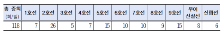 1~9호선, 우이신설선, 신림선이 해당되며 2일간 총 236회 증회(1일 118회)됩니다.