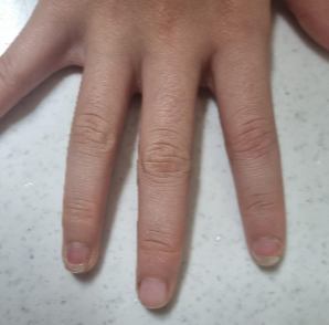 - 손톱이 갈라지고 들뜨는 모습을 보입니다.