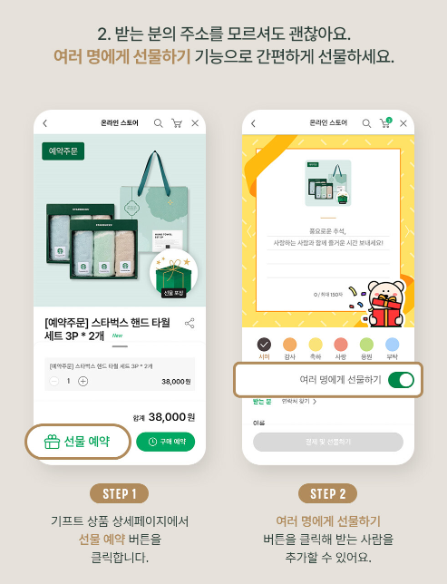 2단계 여러명에게 선물하기 버튼을 클릭해서서 받는 사람을 추가해 주세요..