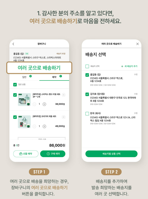 1,감사한 분의 주소를 알고 있다면, 여러 곳으로 배송하기를 선택해서 마음을 전해주세요.