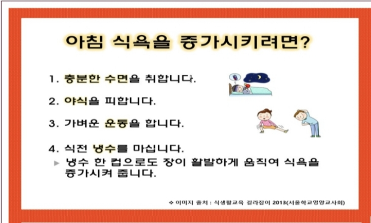 아침식사를 안하고 가는 우리아이들을 위해서 한번더 정리해보고 아침의 중요성을 한번더 생각하는 시간을 갖아보도록 하겠습니다.