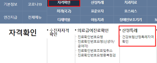 2. 산정특례 메뉴에서 '건강보험산정특례 자격확인'을 눌러 등록여부를 조회를 하면 확인할 수 있습니다.