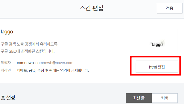 다시 티스토리 스킨 편집에 가서html편집을 클릭해주세요.