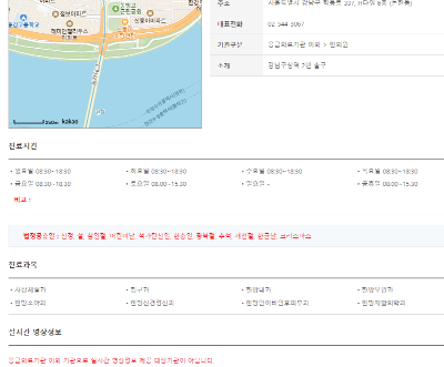여는 시간, 진료과목, 위치, 연락처, 길 찾기, 서비스 제공 여부 등을 포함하고 있습니다.