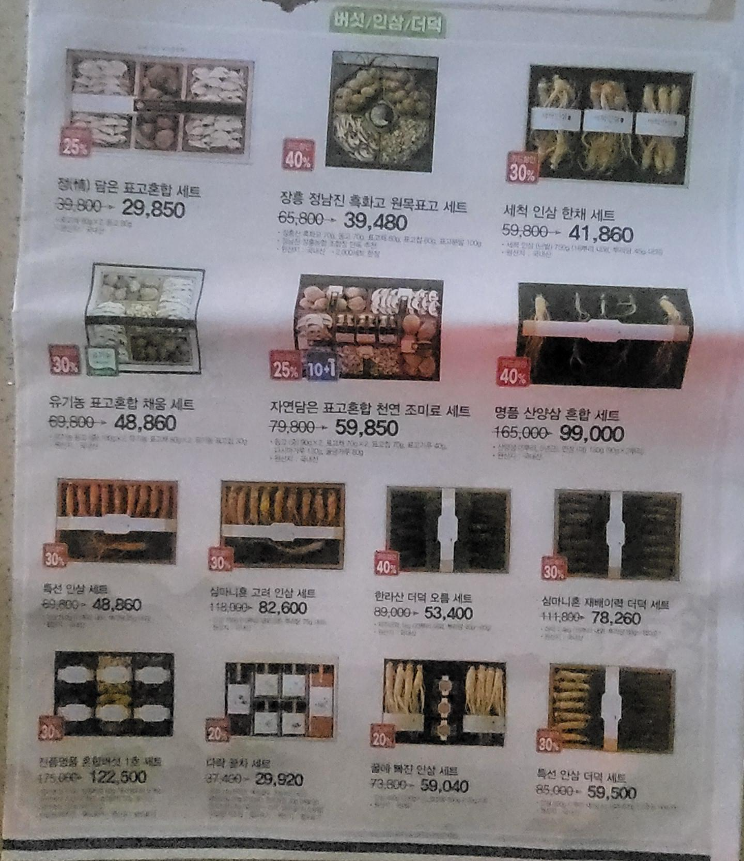 표고버섯, 인삼세트, 더덕 선물세트 가겨은 2만원 후반부터 9만원대까지 다양하게 구성되어 있네요.