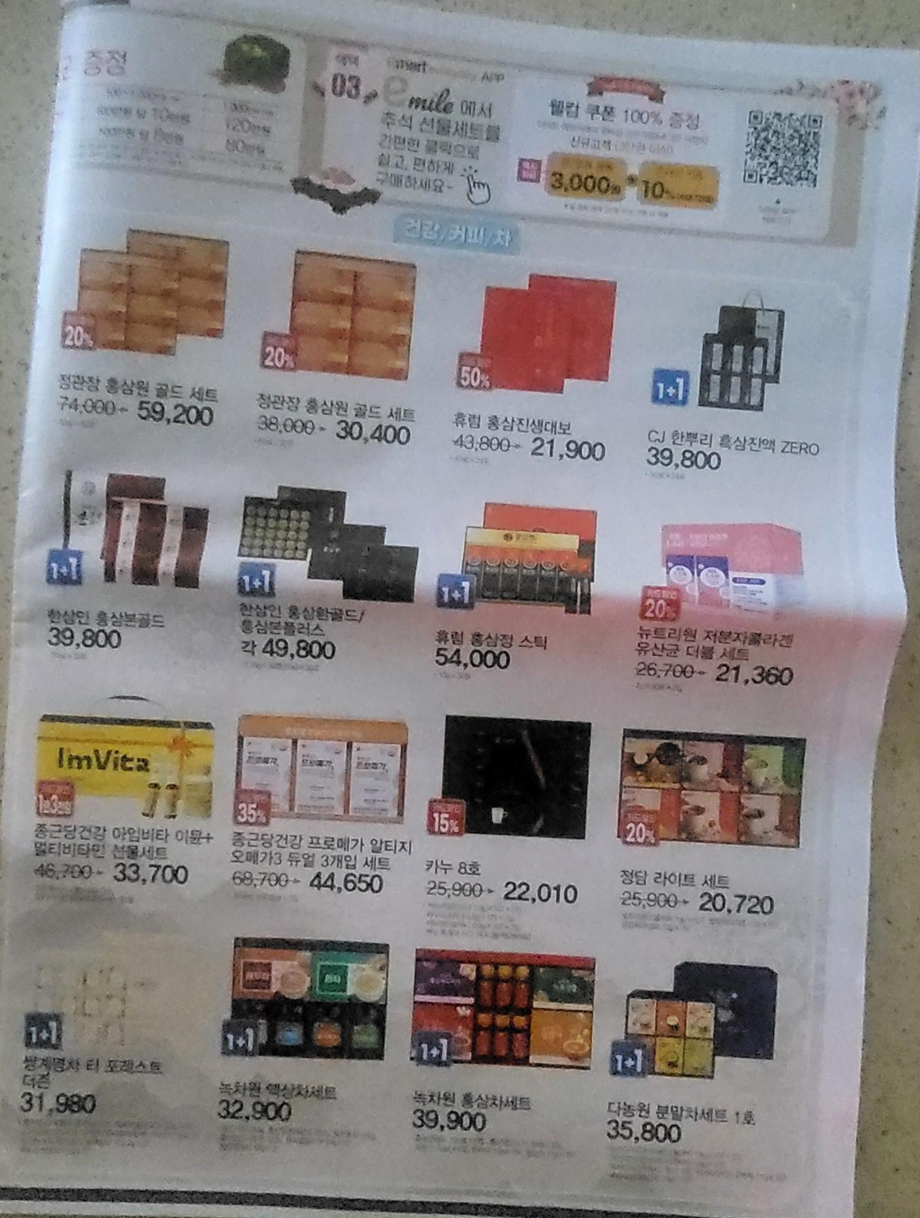 정관장 홍삼원, 한삼인, 뉴트리원 유산균, 종근당 건강 멀티비타민, 카누 8호, 녹차원 선물세트들이 준비되어 있는데요.