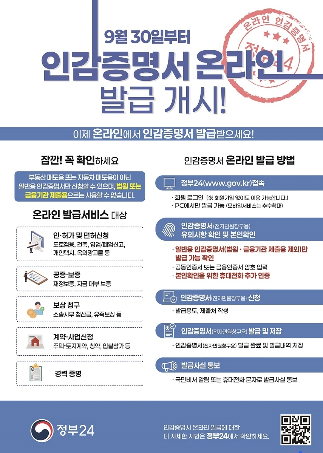 24년 9월 30일부터 <인간증명법 시행령> 개정이 되면서 정부24에서 일반용 인감증명서를 무료로 발급받을 수 있게 되었는데요.